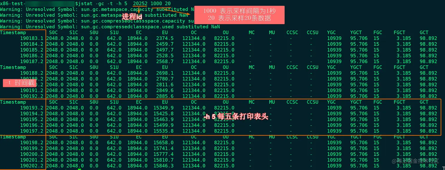 -option必选参数表示命令参数 如gc等,-t为可选参数表示是否打印时间(秒),-h<lines>可选参数,表示每隔多少行打印头部列表,如设置-h 5, 那么每五条记录就会重新打印表头,vmid必选参数,Java进程id,interval可选参数表示采样的时间间隔,count可选参数表示需要采样多少条,