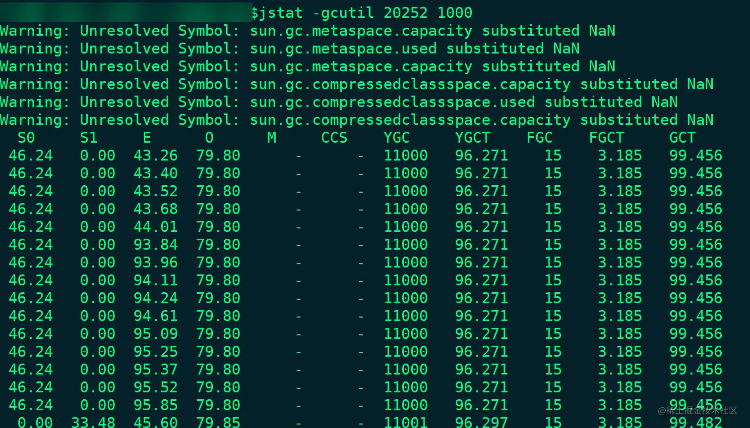 S0C: 新生代中第一个Survivor(即From区)的容量大小 (千字节)S1C: 新生代中第二个Survivor(即To区)的容量大小 (千字节)S0U: 新生代From Survivor区已使用内存大小(千字节)S1U: 新生代To Survivor区一使用内存大小(千字节)EC: 新生代Eden区的容量大小(千字节)EU: 新生代Eden区已使用内存大小(千字节)OC: 老年代空间容量大小(千字节)OU: 老年代已使用内存大小(千字节)MC: 方法区的空间大小 (千字节)MU: 方法区已使用的空间大小(千字节)YGC: 从系统启动到现在Young GC/Minor GC的次数YGCT:Young GC总耗时(秒)FGC:从系统启动到现在Full GC的次数FGCT:Full GC的总耗时(秒)GCT: 垃圾回收总的耗时(秒)NGCMN:年轻代(young)中初始化(最小)的大小 (千字节)NGCMX:年轻代(young)的最大容量 (千字节)GC:年轻代(young)中当前的容量 (千字节)OGCMN:old代中初始化(最小)的大小 (千字节)OGCMX:old代的最大容量 (千字节)OGC:old代当前新生成的容量 (千字节)PGCMN:perm代中初始化(最小)的大小 (千字节)PGCMX:perm代的最大容量 (千字节)PGC:perm代当前新生成的容量 (千字节)S0:年轻代中From survivor(幸存区)已使用的占当前容量百分比S1:年轻代中To Survivor(幸存区)已使用的占当前容量百分比E:年轻代中Eden(伊甸园)已使用的占当前容量百分比O:old代已使用的占当前容量百分比P:perm代已使用的占当前容量百分比S0CMX:年轻代中From survivor(幸存区)的最大容量 (千字节)S1CMX:年轻代中To Survivor(幸存区)的最大容量 (千字节)ECMX:年轻代中Eden(伊甸园)的最大容量 (千字节)DSS:当前需要survivor(幸存区)的容量 (千字节)(Eden区已满)TT: 持有次数限制MTT: 最大持有次数限制