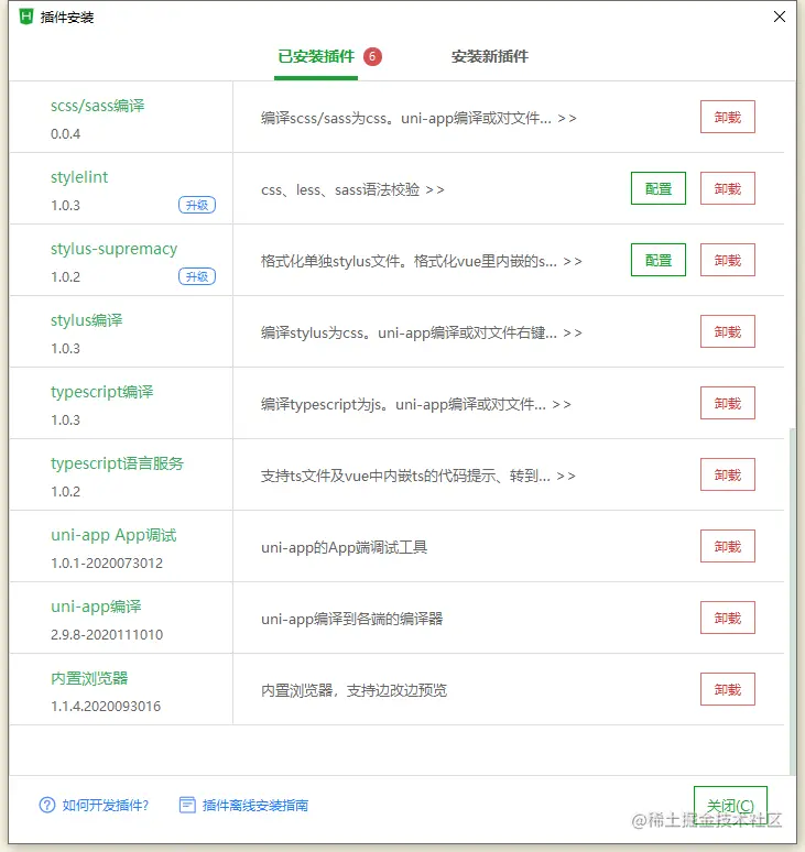 安装之后,打开编辑器,首先要做的就是安装插件啦,点击工具的工具选项,点击插件安装,一般开发用的css预处理器(less.scss),uni-app多端编译,App调试等,可以通过插件市场查找更多的插件。