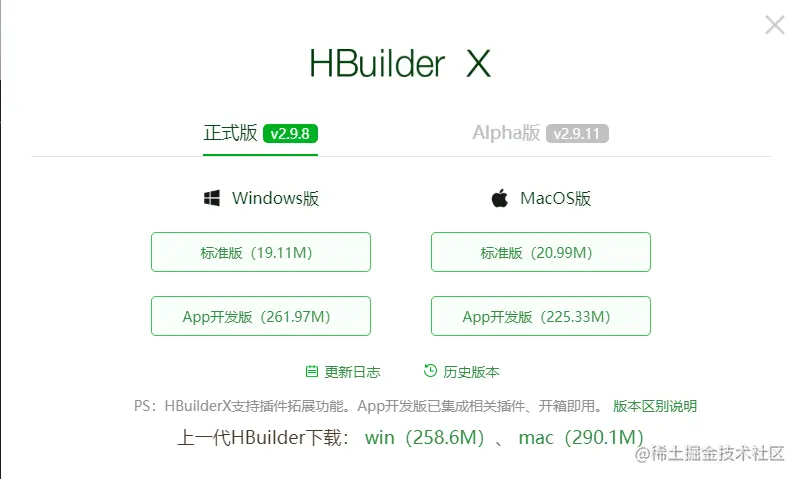 HbuilderX提供windwos和mac两个系统的版本,并且有正式版和Alpha版本,Alpha为最新功能发布版本,但不够稳定,适合尝鲜新功能,各位小伙伴按需下载安装即可。
