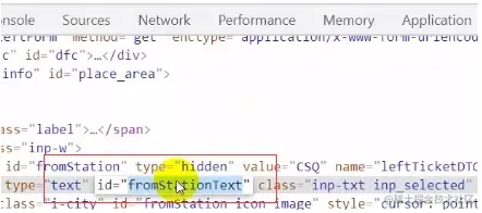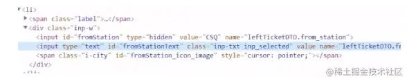 需要注意的是12306这个input标签和普通的input标签有点不一样。它并不是来读取我们这个里面的长沙和北京的 而是根据它里面的一个 value值 CSQ就是长沙的代号。所以你在查询的时候它就是根据这个代号进行操作的,就非常的麻烦