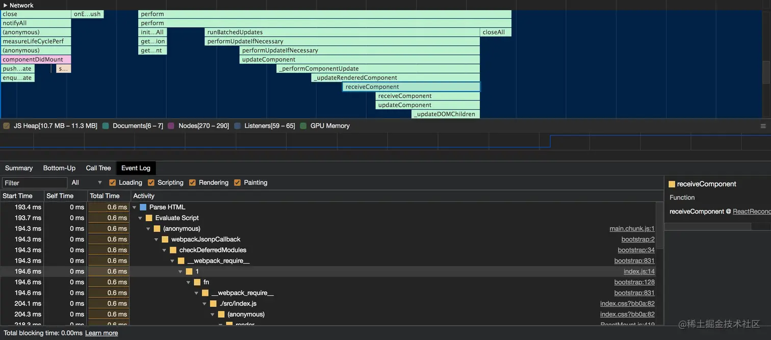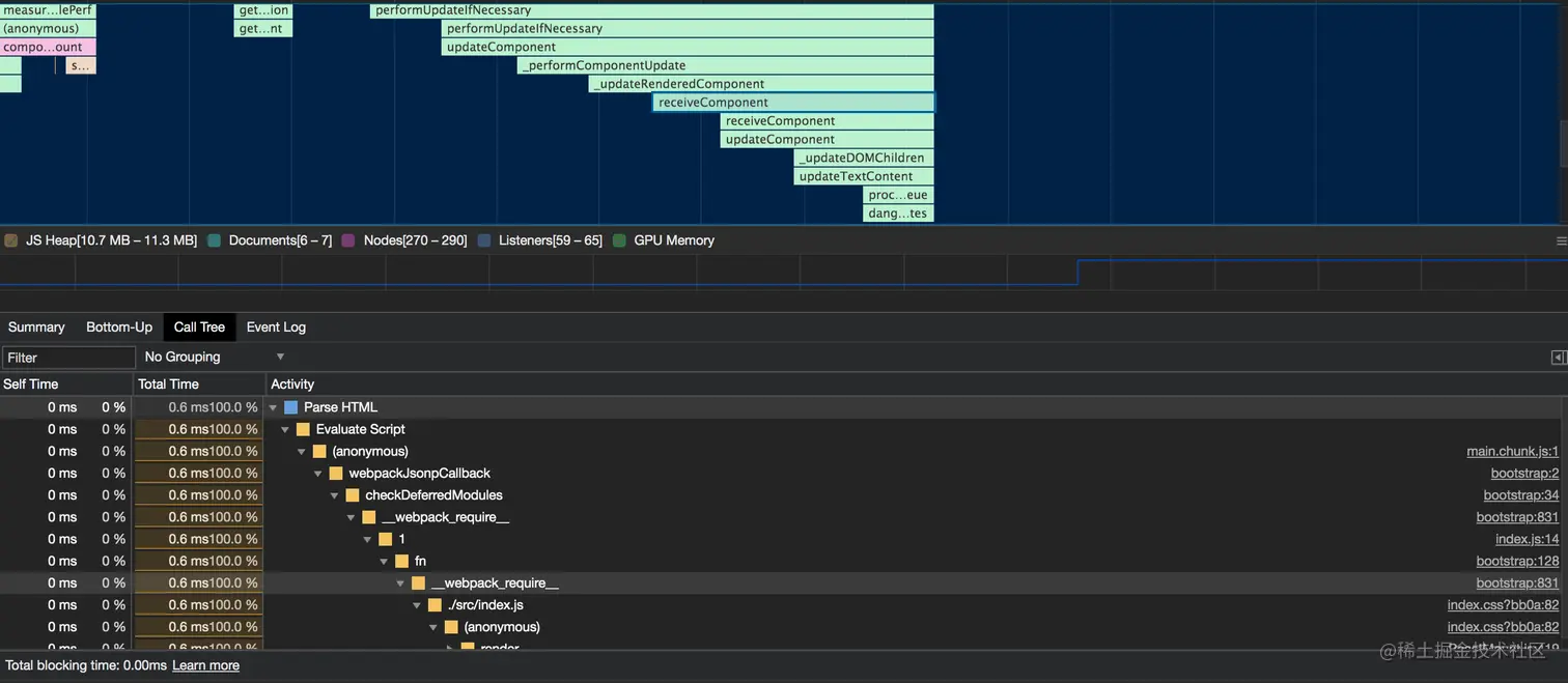 从上往下的调用栈,就是从 Parse HTML 一直到 receiveComponent 这条线的调用栈。 可以通过过滤框搜索关键词,或者通过 group 进行分类。