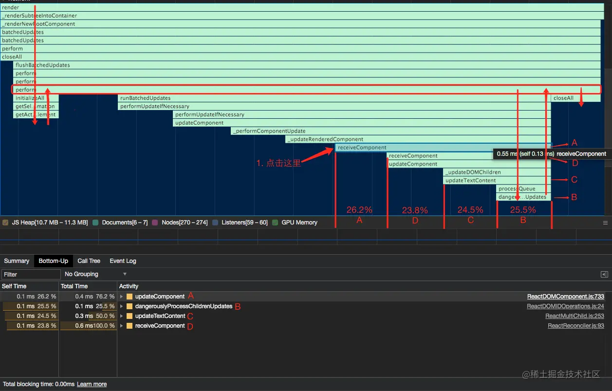 从 render 开始向下,然后回到红框标注的 perform ,然后一直向下到 B 所在的 dangerouslyProcessChildrenUpdates,然后回到红框标注的 perform,最后执行了 closeAll