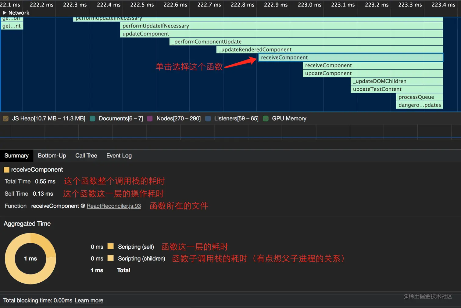 可以看到 receiveComponent 下耗时的所有调用栈,在点击打开各个调用栈还可以更多的耗时信息,最终找到真正的耗时操作。