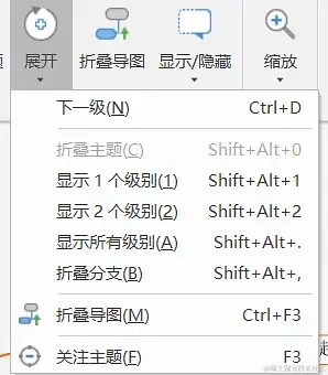 在展开选项中,我们可以点击“下一级”,然后一级一级逐次展开导图,当然了,我们也可以点击“显示所有级别”直接展开所有分支。
