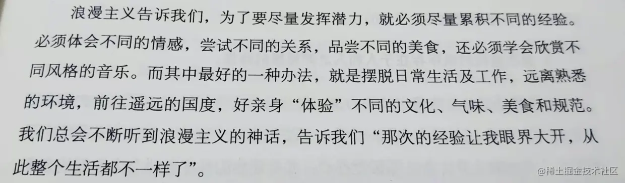 - 我喜欢去旅行,因为可以增长见识,体会不同的生活、文化。如果只从肉体层面上看,旅游到处奔波,只是场受罪。但是心灵上得到了满足,而这满足就是上面浪漫主义的作用。现代人对于旅行是有强烈欲望的,但是如果在古埃及人看来,他们更想着是能有一个如金字塔一样的华丽的陵墓,而现代人的对此欲望并不强。可见人的欲望是会受到教育和社会观念所影响,而这两者都是虚构想象出来的,它们是为了更好维持社会的秩序。(这里的教育指文科一类)