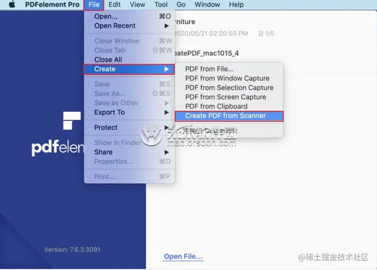 启动Mac版PDFelement,以开始从Mac版扫描仪创建PDF文件。只需单击Mac顶部菜单(主菜单)上的“文件”>“创建”>“来自扫描仪的PDF”按钮。这样做将自动激活“从扫描仪创建”功能。