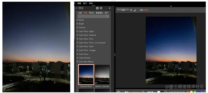 可以看到使用exposure给视频进行后期处理很简单。点击预设,下拉,找到Color Misc Effects 找到Blue and Yellow,选择这款滤镜就好啦(如图一)。可以看下对比,效果很明显!是不是很简单?Exposure的滤镜很丰富,我们还可以试试别的图片。