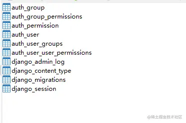 解决完mysql模块缺失问题后,再次执行建表语句,执行成功就可以看到django自动生成的数据表了,如下图