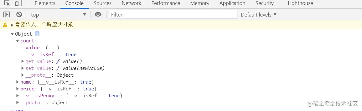 从结果中可以看出,通过ref, 我们可以将原始值转化为响应式对象,这个值被存放到该对象内部的value属性中,需要使用.value 的方式才能取到这个值,当然Vue3,在模板中直接使用,无须使用这种方式。