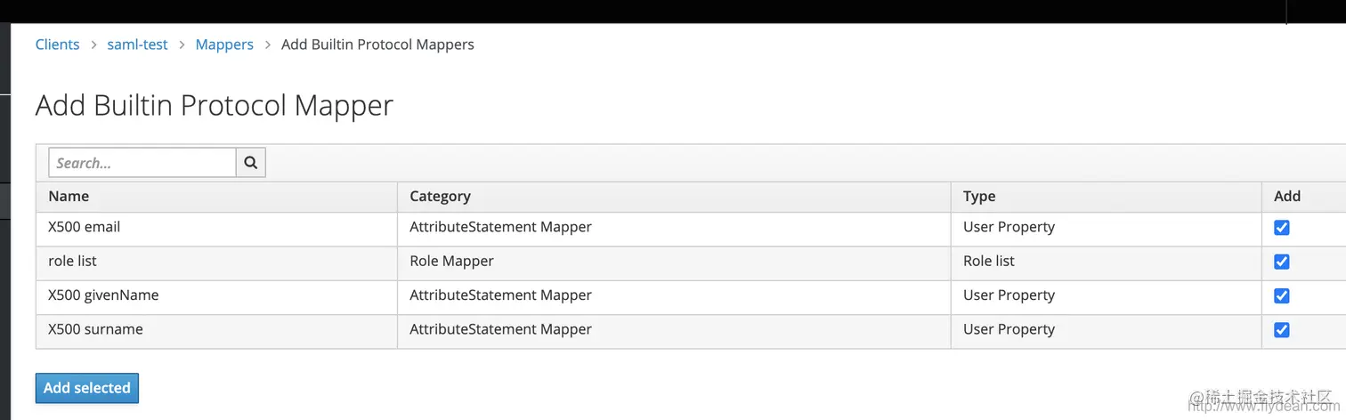 接下来我们需要点击mappers,创建一些用户信息和token claims的映射信息,从而能够在saml的请求中包含这些用户信息。