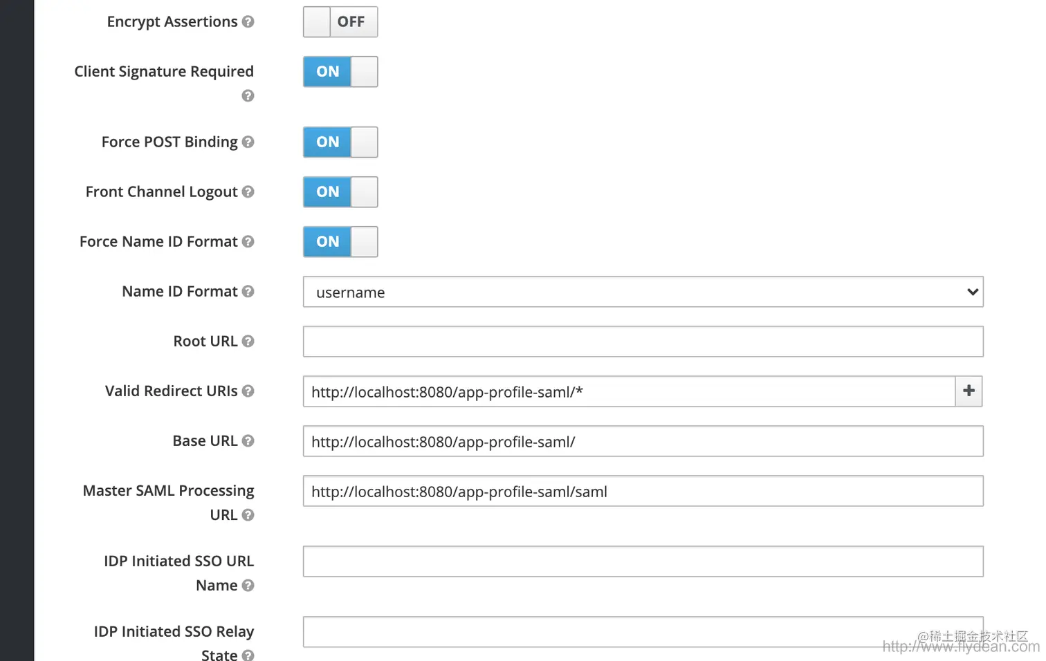 成功创建client之后,假设我们要部署的应用程序名叫做app-profile-saml,则需要添加下面的信息: