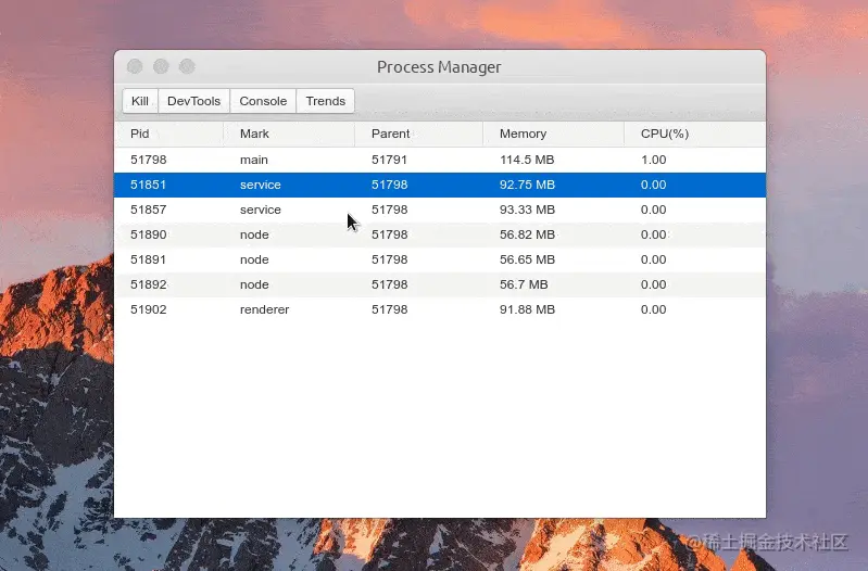 展示Electron应用中所有开启的进程,包括主进程、普通的渲染进程、Service进程(由electron-re引入)、ChildProcessPool创建的子进程(由electron-re引入)。