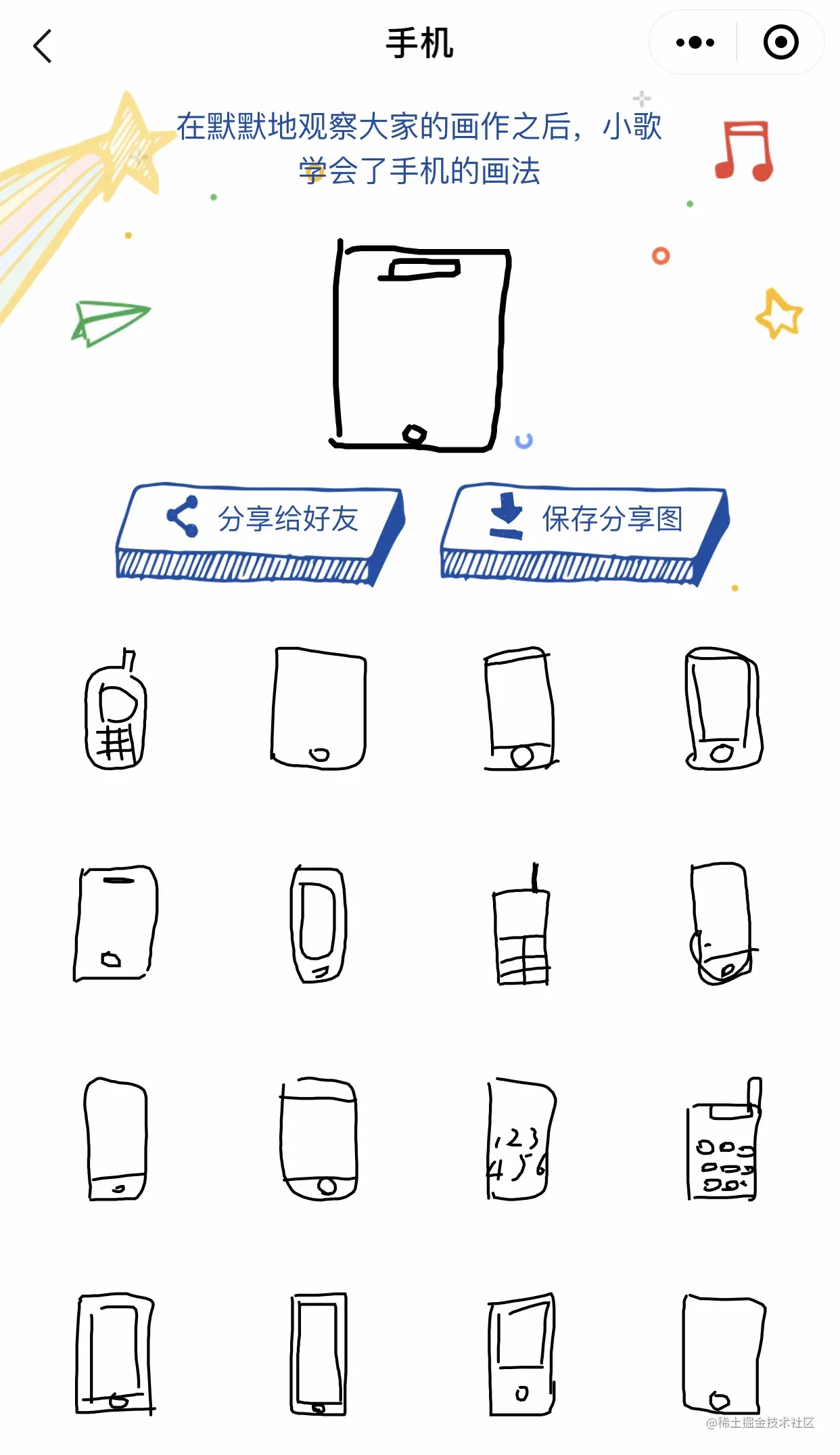 二月份,在家看了很多老电影和电视剧。玩猜画小歌的时候发现一个有意思的点:虽然我见过天线手机、使用过按键手机,但是在画手机的时候第一直觉都是类似 iPhone 样式的,还在画作里发现了古董。