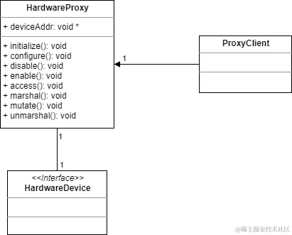 模式结构非常简单,可能客户会有多个,但是每个硬件设备仅有一个硬件代理,客户只能访问代理接口,无法直接访问硬件就是这个模式的目的。