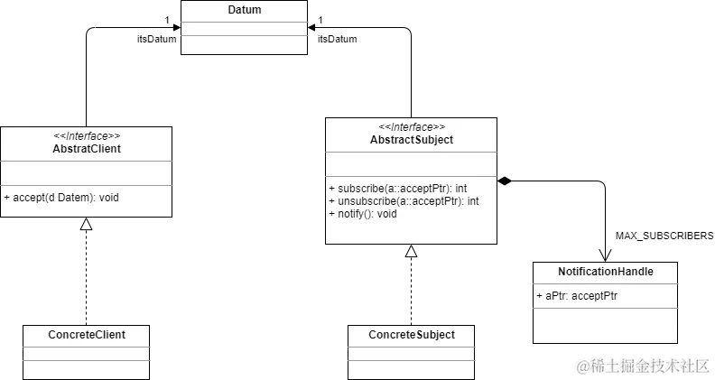 它包含了accept(Datum)函数,当AbstratClient订阅时或者AbstratSubject认为有适合发送数据是调用它。AbstratClient是抽象的,不提供任何具体实现。