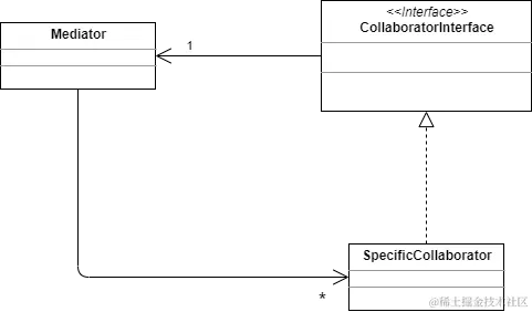 在模式中协调所有的具体合作者。中介者对于每个具体合作者都有一个链接,以便他能给具体合作者发送信息。此外,当有事情发生时,每个具体合作者必须能给中介者发送消息。中介者提供协调的逻辑。
