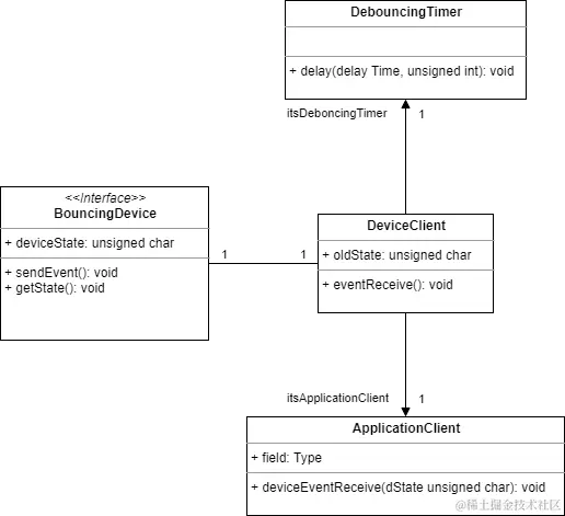 是用于处理进入事件的中断,去除抖动,并读取确保代表实际设备状态。它的eventRecevie()函数通过BouncingDevice的sendEvent()函数激活。同时,它需要设置延时定时器,去抖动事件过后,如果状态与第一次读取的一致,证明值是真实的。这样它就发送相应的信息给ApplicationClient。旧状态保存在变量oldState中,每当状态发生改变的时候更新这个变量。