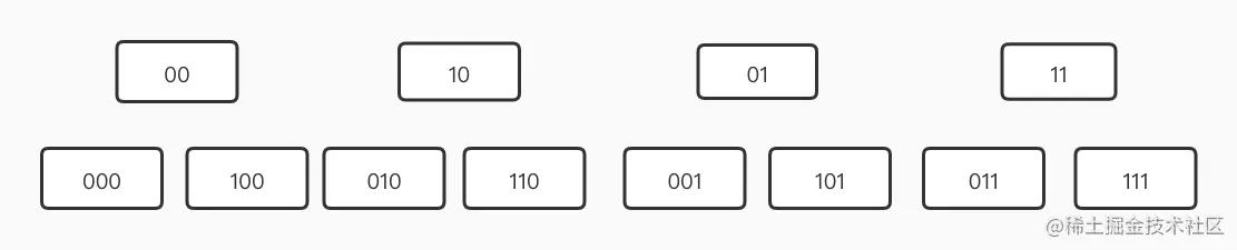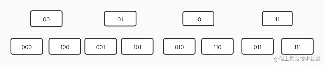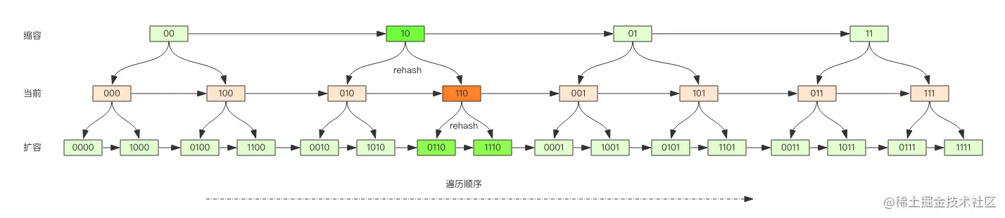 这张图是正常的低位进位,如果遍历到01发生扩容,接下来继续遍历: