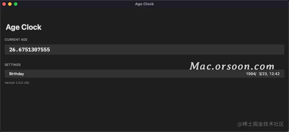 在《Age Clock》中输入你的出生日期及时间,app 顶部就会自动计算出你现在的年龄,精确到小数点后 10 位,也就是千分之三秒,看着 app 界面,你可以非常明显的感受到生命的流逝。