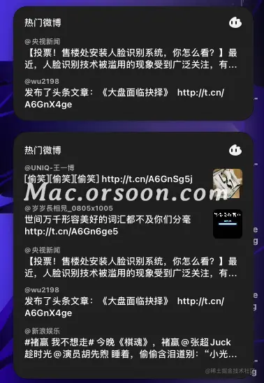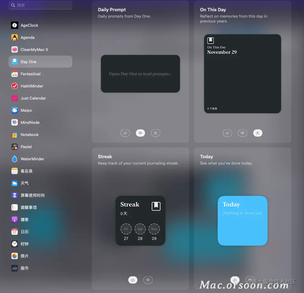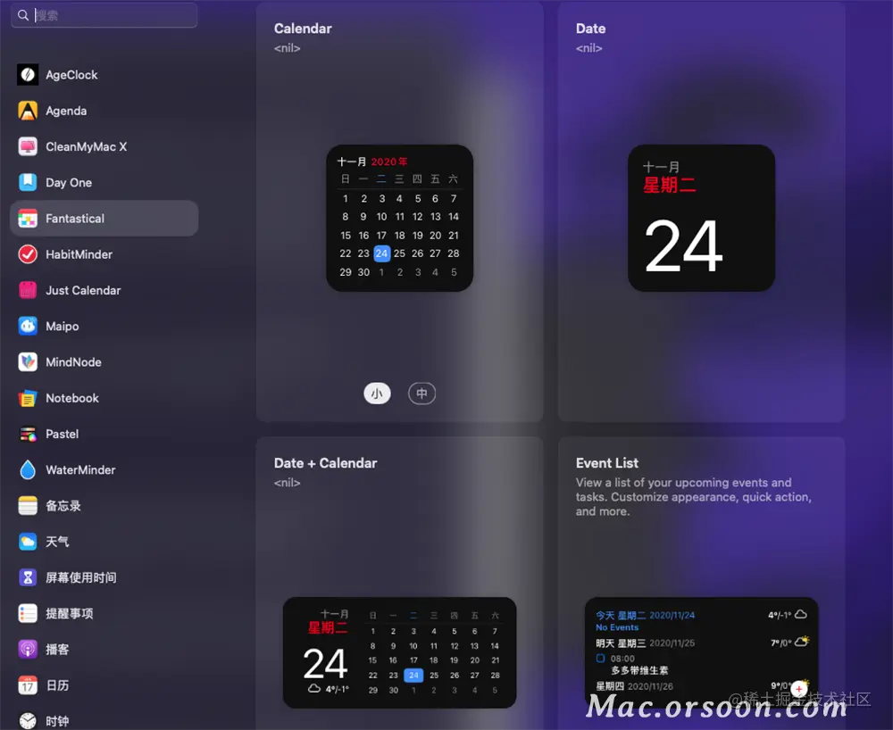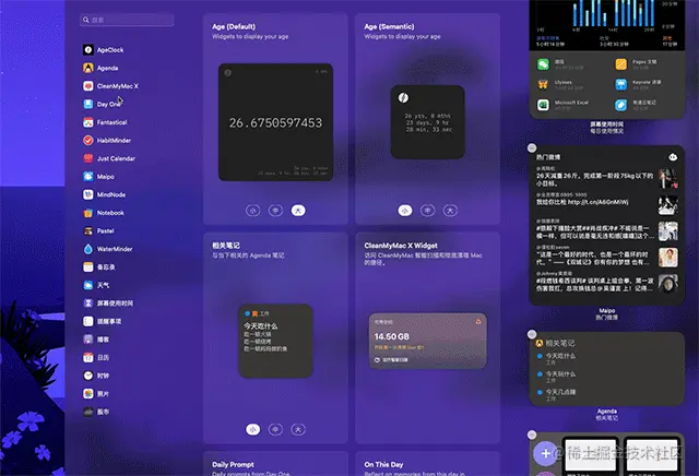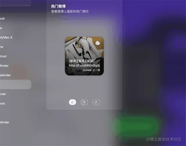 设置好的小组件与 iOS 上的小组件类似,macOS 的小组件同样不能进行复杂操作,只能用来展示信息。macOS 提供了大、中、小 种尺寸,你可以选择适合的尺寸,将它们拖动到通知中心列表中,在列表中随意拖动,就能调整它们的位置。