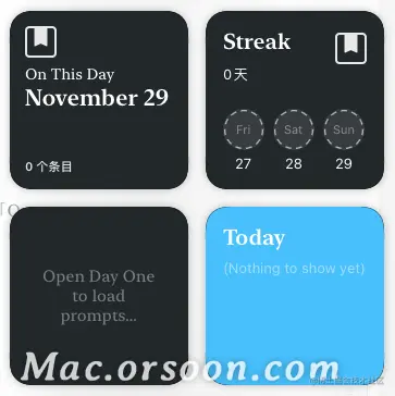 《Day One》这款日记 app 共为用户提供了 4 中不同的小组件类型,它们分别是可以为你展现那年今日的「On This Day」、提醒你每天写日记的「Streak」、展示今天日记内容的「Today」以及为你提供日记灵感的「Daily Prompt」。