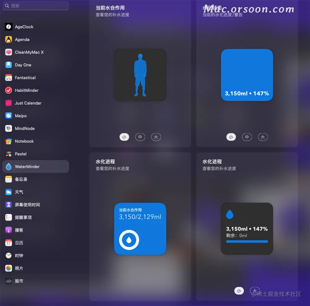 与手机端的小组件类似,《WaterMinder》一同提供了五种小组件可供选择,用人体、水桶、水环等形式提示我们今天还应该喝多少水。