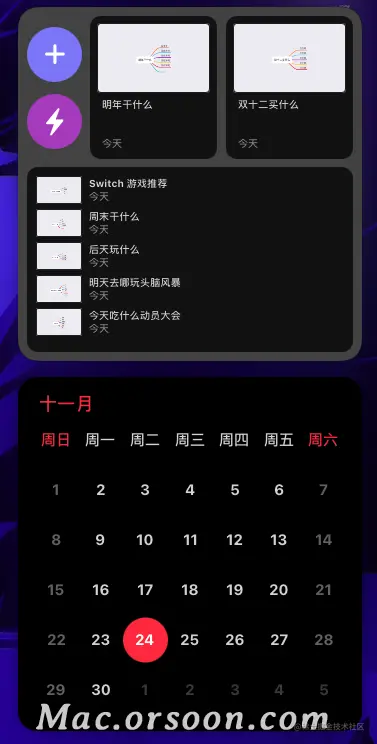 双指在触控板边缘轻轻左划,就可以看到微博热搜、待办事项,也可以通过小组件进 入思维导图,快速开启工作流程,相比在程序坞和启动台中寻找 app 图标,小组件不仅更高效,也更直观。