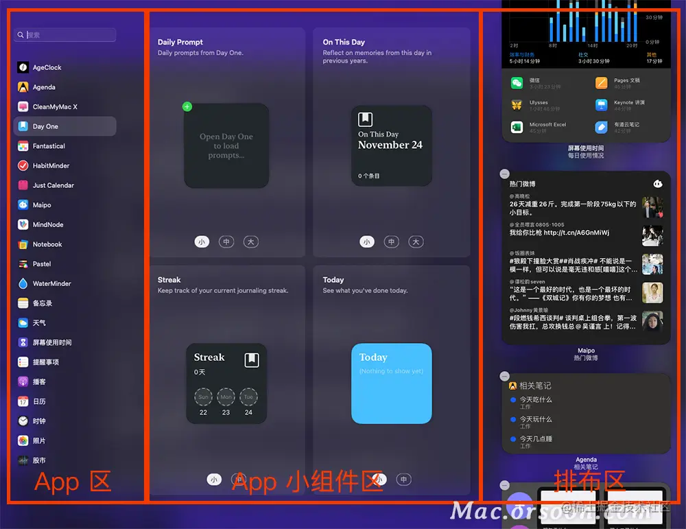 将 macOS 的通知中心上划到底部就可以看到「编辑小组件」的选项,点击进 入编辑界面,左侧是提供小组件的 app,中间是 app 对应的小组件,右侧是你通知中心的排布情况。