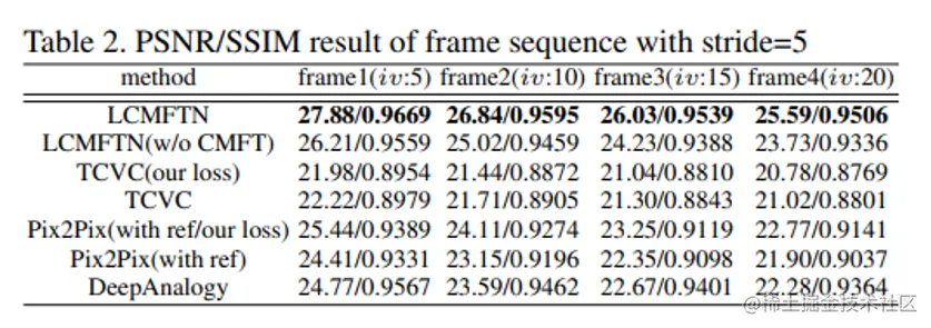 文章对 LCMFTN 模型在 7 部真实动画电影数据上进行测试,分别在小运动和大运动情况下对连续片段上色进行了对比,在 PSNR 和 SSIM 指标上效果均明显优于目前的主流 state-of-the-art 方法(包括 TCVC[4],DeepAnalogy[2],Pix2Pix[5] 等)
