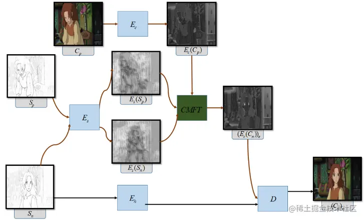 的上色帧。作者设计了一个名为 CMFT 的结构来将参考帧的颜色特征变换到待上色帧,这个结构也可以用到其他 image analogy 问题上。