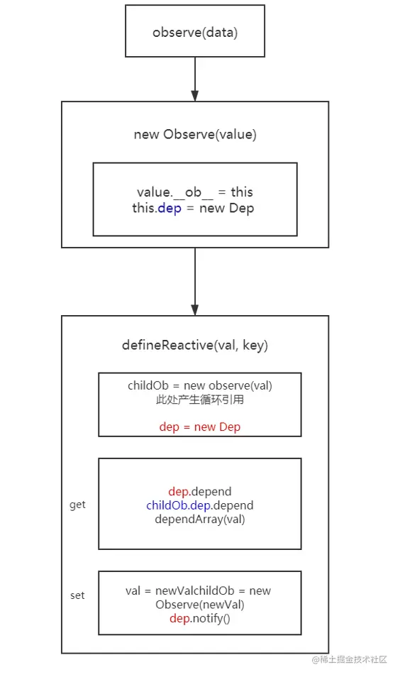 defineReactive函数内创建了一个dep对象,其为一个闭包对象,通过dep来进行依赖收集与派发更新。
