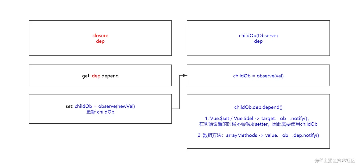 下图是Vue2中的两种dep实例,红色的是闭包dep,蓝色的是childOb的dep