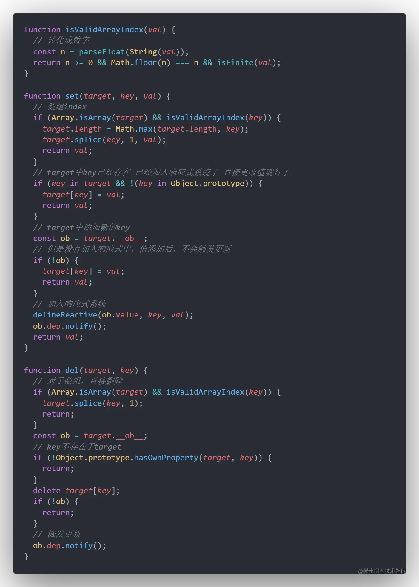 在对象上添加新元素的时候,是不会触发setter的,因此也就不能够做派发更新与依赖收集了。