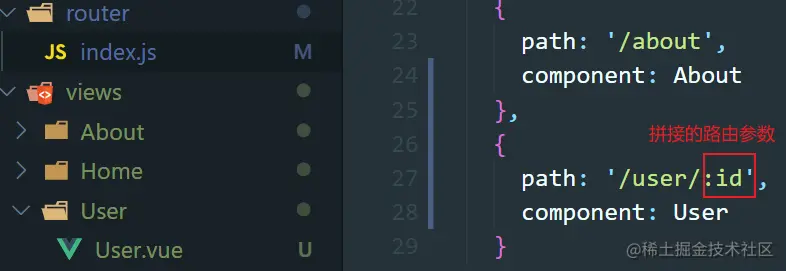 - 不同的路由跳转到同一个组件时需要在后面拼接参数,如 user/abc