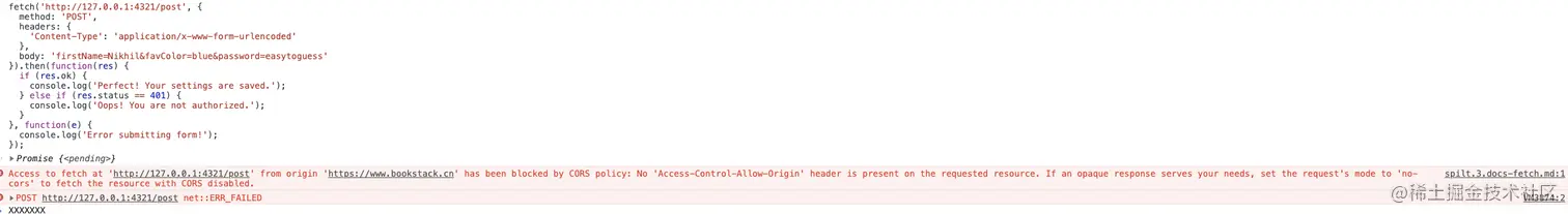 CORS请求失败会产生错误,但是为了安全,在JavaScript代码层面是无法获知到底具体是哪里出了问题。你只能查看浏览器的控制台以得知具体是哪里出现了错误。