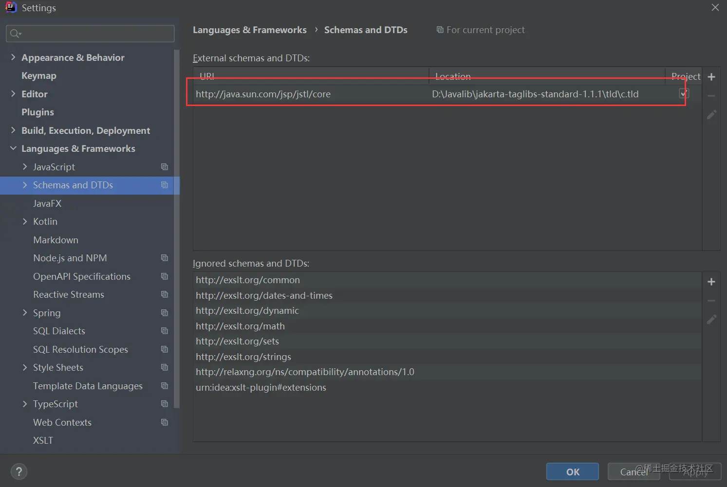 - 此时你会发现写代码的时候标签还是会被标红,这时候我们还需将tld文件配置进去,打开IDEA的settings,然后搜索DTDS,找到Schemas and DTDs,接着点击External Schemas and DTDs窗口右侧的+号,在URL中输入java.sun.com/jsp/jstl/co…