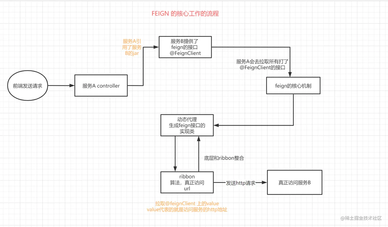 然后feign底层将服务B的interface进行了动态代理,动态代理的类是和ribbon和hystrix整合的