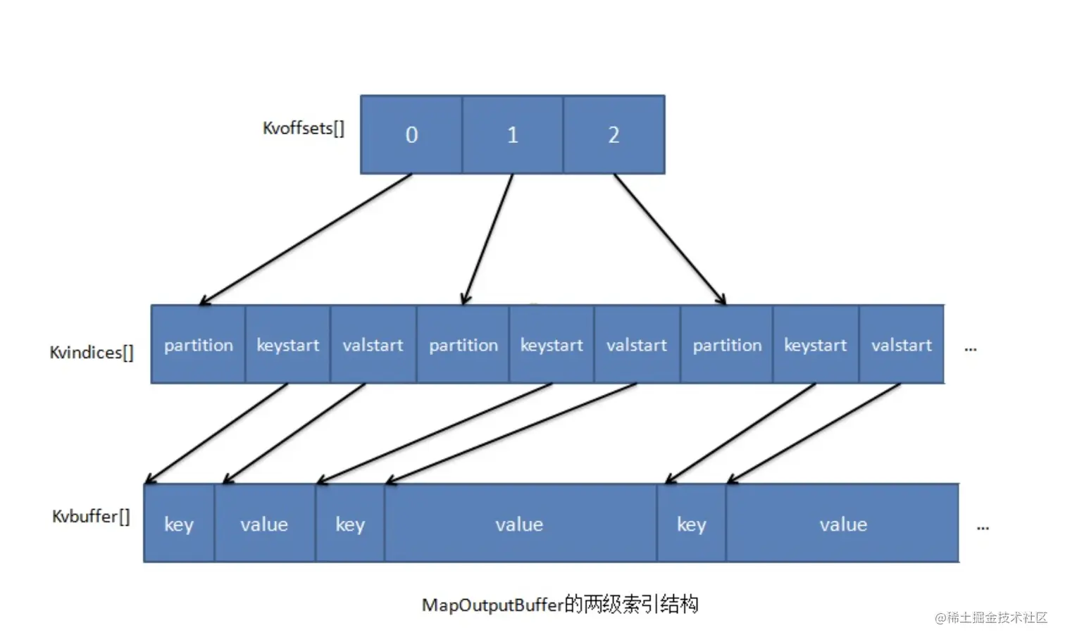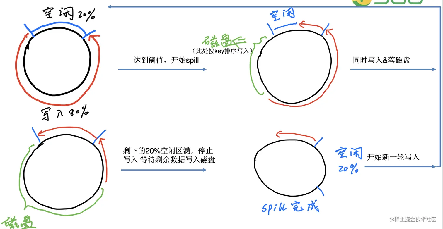 - 当数据全部落入磁盘,本轮spill完成,开始新一轮的写入,溢出。 环形缓冲区结构: