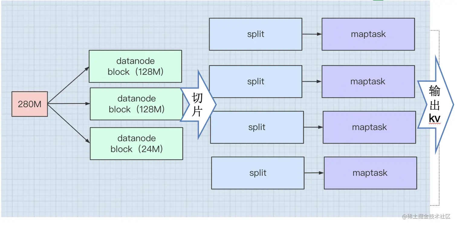 - 文件会被切分为三个block,(hadoop2.0以后默认每个datanode的block大小为128M),每个split与maptask是一一对应的关系。split的数量由