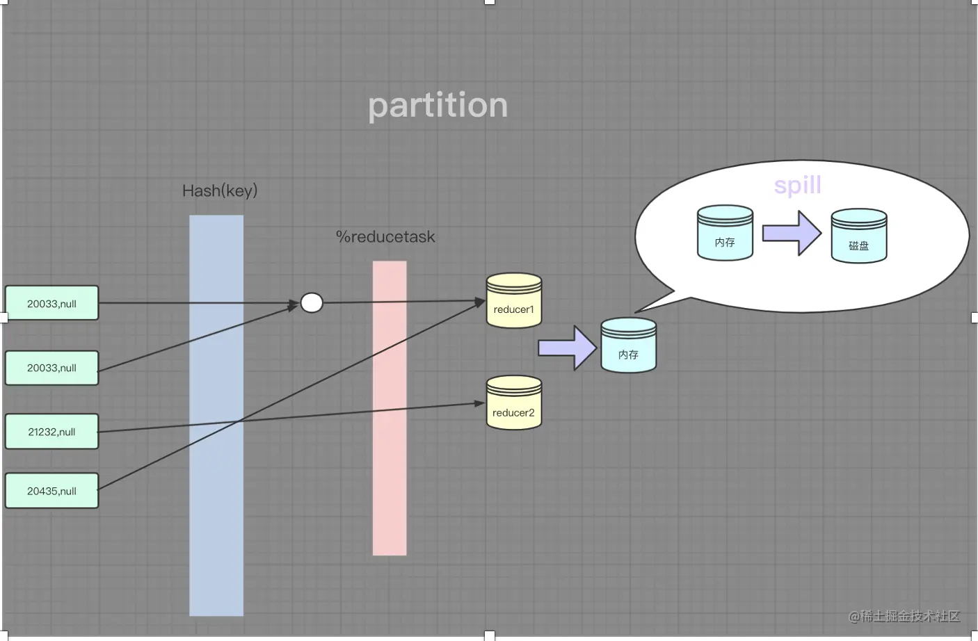 // 当写达到缓冲区阈值后进行写磁盘->临时文件 ,此时进行分partition排序 ,快排序先比较partition,在比较值