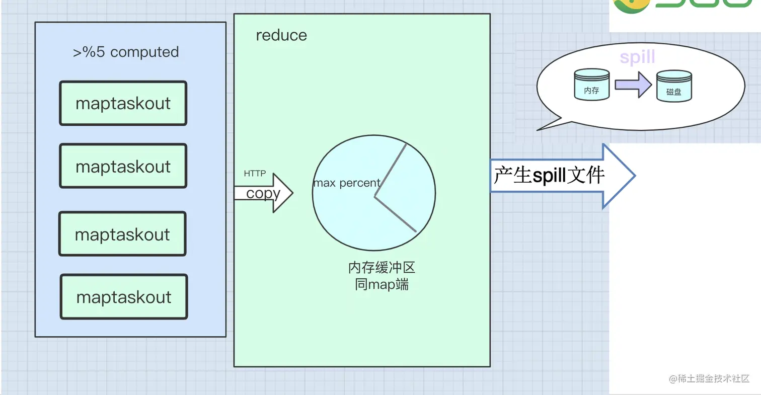 - 当map任务完成超过一定百分比后,触发了reduce进程,通过http请求map端数据到内存中处理,与map端内存缓冲区类似,溢写文件过程类似