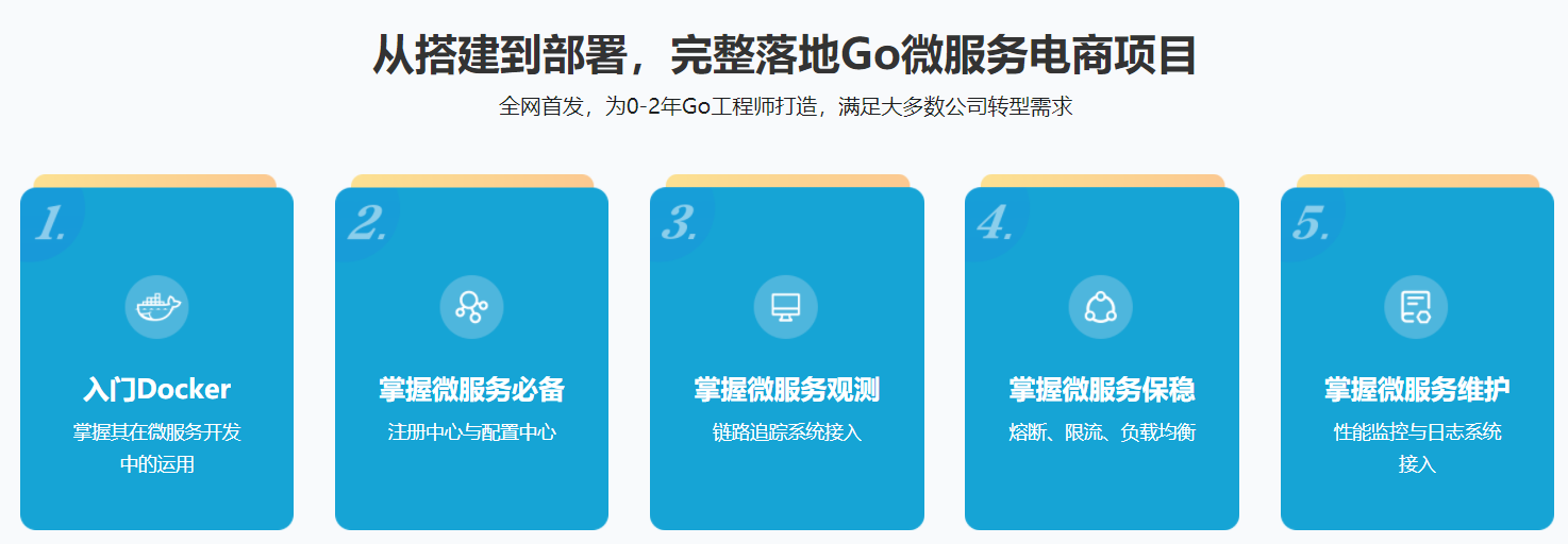 从搭建到部署,完整落地Go微服务电商项目 全网首发,为0-2年Go工程师打造,满足大多数公司转型需求 入门Docker 掌握其在微服务开发 中的运用 掌握微服务必备 注册中心与配置中心 掌握微服务观测 链路追踪系统接入 掌握微服务保稳 熔断、限流、负载均衡 掌握微服务维护 性能监控与日志系统 接入 以电商项目为载体,基于Go结合Docker构建容器化、可监控的完整微服务系统 让能Docker的都Docker,让可观测的都能观测 微服务深度应用 电商项目贯穿,逐步构建技术体系 组件完全容器化 环境/代码自动生成,方便快捷 微服务完整闭环 开发-部署-监控,完成完整微服务闭环
