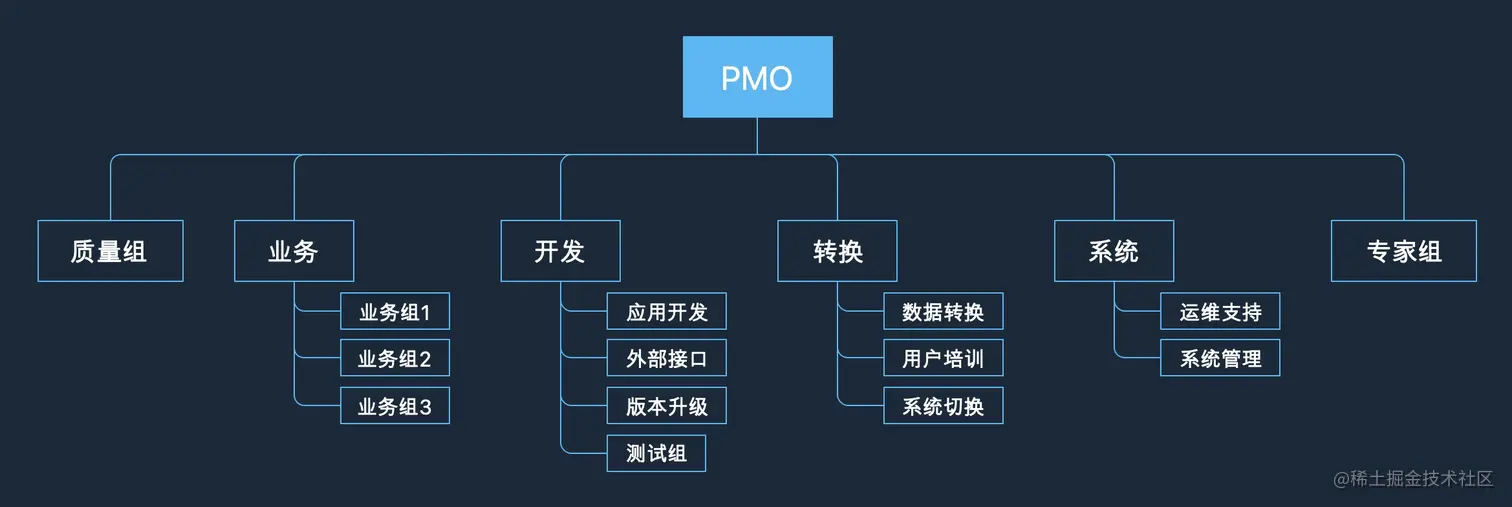 | PMO | 负责制定和监控项目计划,协调项目资源,与项目内外相关组织进行沟通,以及项目日常事务管理,保证项目按计划实施 |