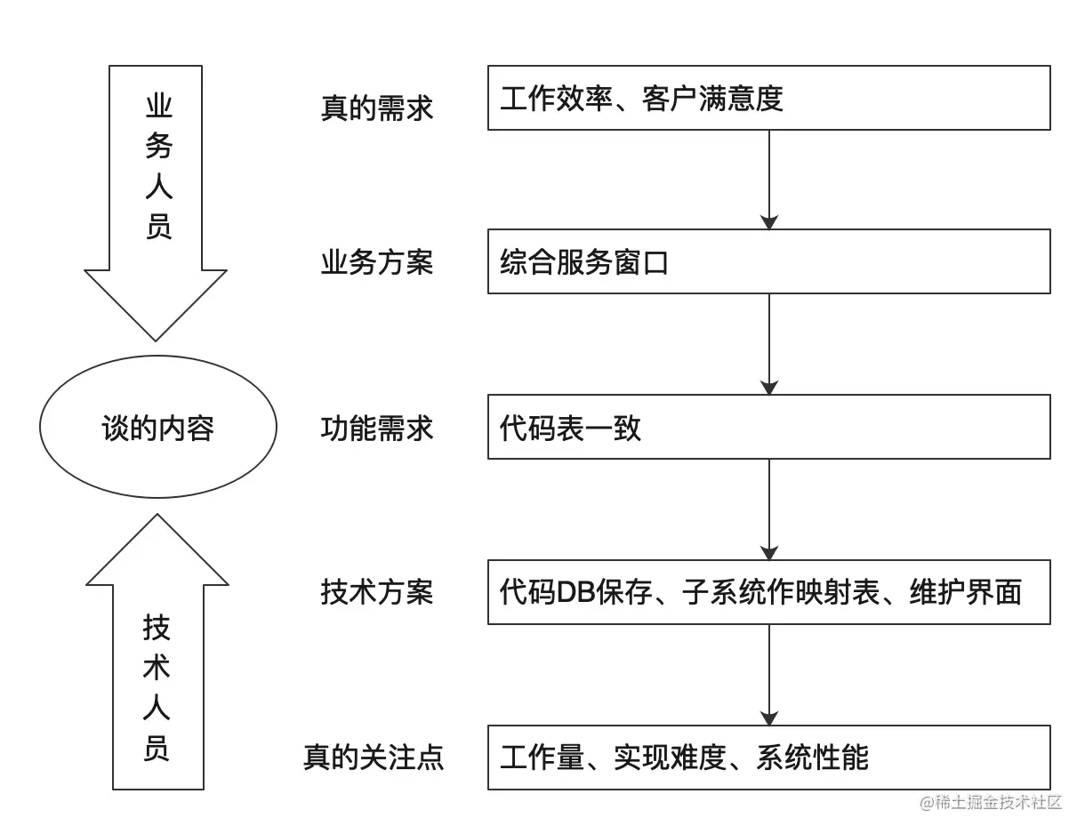 业务人员关注的是系统如何支持业务流程,背后的需求是“实现业务目标”。技术人员关注的是合理技术方案,背后的需求是“工作量”、“实现难度”和“系统性能”。