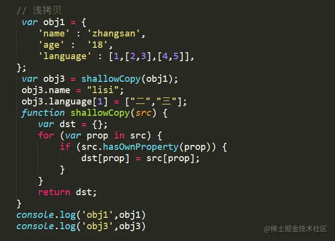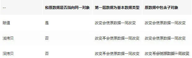 上面例子中,obj1是原始数据,obj2是赋值操作得到,而obj3浅拷贝得到。我们可以很清晰看到对原始数据的影响,具体请看下表: