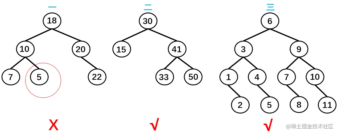 - 条件 2:非空右子树的所有键值大于其根节点的键值。