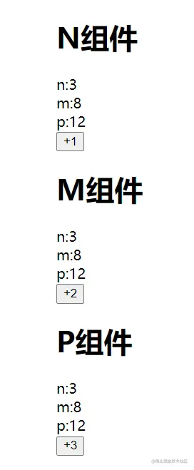 在一番对 n,m,p 数据的操作后,所有组件的值都变化了更新